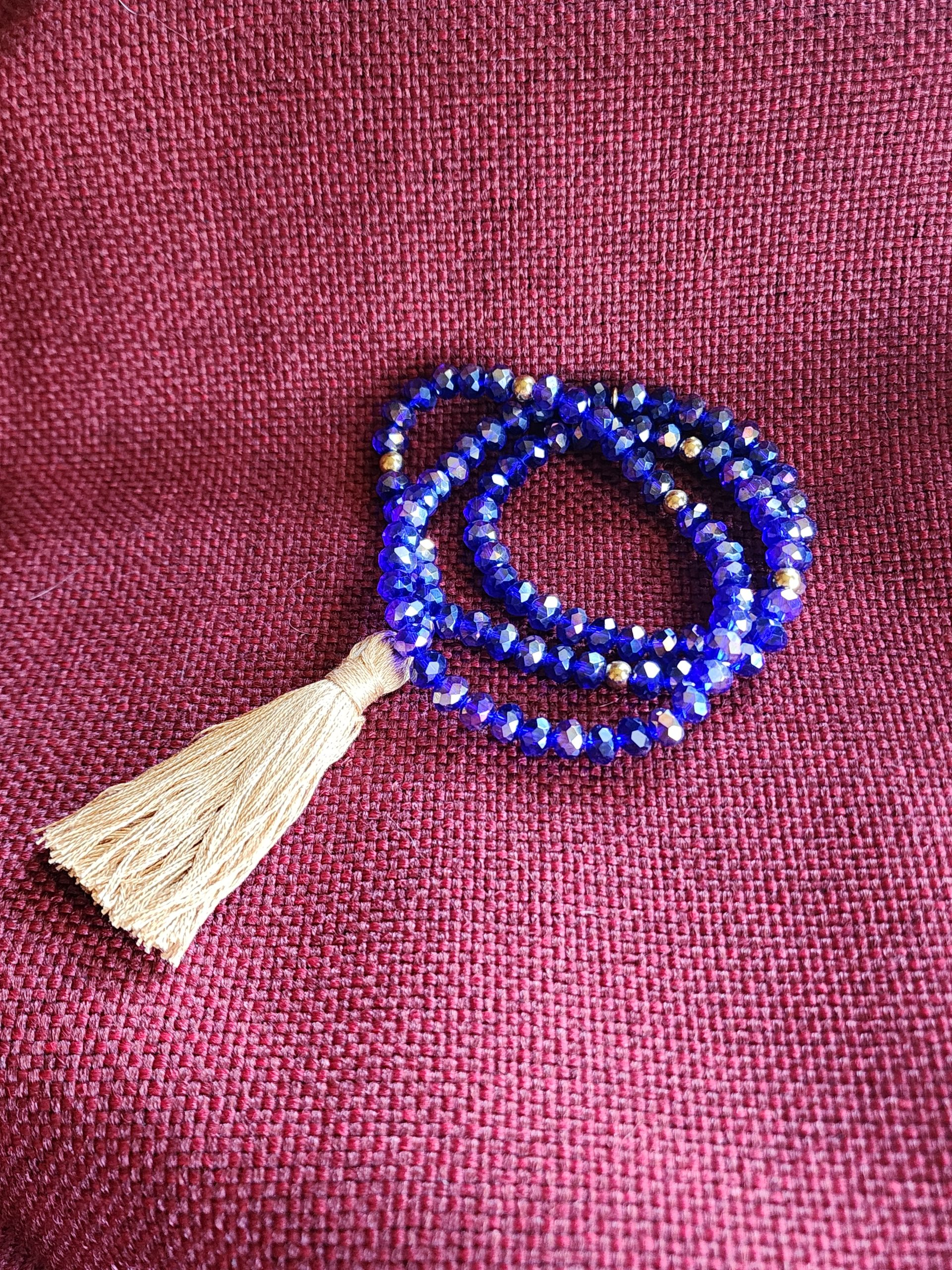 This beautiful blue mala is made from faceted Czech crystal with a cream colored tassel.